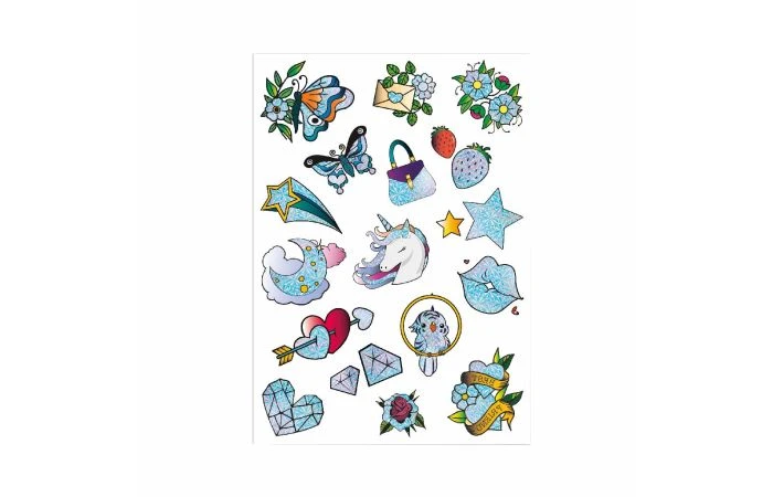 Talloze fonkelende glittertattoos waarmee je je eigen stijl met een elegante touch kunt verfraaien. Knip de tatoeage uit die je wilt, breng op de huid aan, dep met het sponsje en klaar is Kees! Speelgoed dat de creativiteit stimuleert en waarmee kinderen zich bij elke gelegenheid met een originele look kunnen presenteren! Wordt geleverd op blisterkaart. Geschikt voor kinderen vanaf 6 jaar.