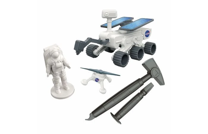 De set bevat een gipsen baksteen, hamer en beitel om een marsrover, drone, astronaut en fragment van een meteoriet uit te delven! Bouw de rover en de drone en ga als een echte astronaut op een geweldige missie! Een handleiding met veel wetenswaardigheden over de missies waarmee de mens de ruimte heeft ontdekt! Wordt geleverd in full-colour doos. Geschikt voor kinderen vanaf 6 jaar.