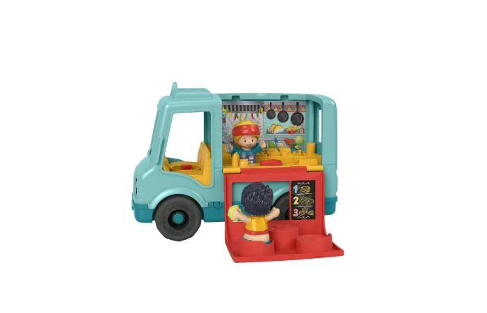 Fisherprice Little People Foodtruck. Je bestelling graag! Peuters beleven uren heerlijk speelplezier wanneer ze een bestelling plaatsen, gerechten bereiden en serveren met de Little People Service hamburgertruck. Druk op de knop of op de bestuurdersstoel van dit speelgoed met muziek en luister naar de verschillende liedjes, geluiden en zinnen voor nog meer speelplezier. De hamburgertruck heeft een keuken en een uitklapbaar eetgedeelte. En met de twee Little People figuren kun je eindeloos veel leuke verhalen bedenken! Wordt inclusief 2 AA-batterijen geleverd in try-me verpakking. Geschikt voor kinderen vanaf 1 jaar.