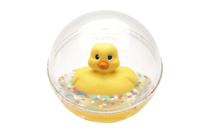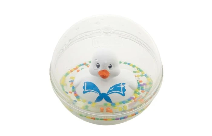 Een doorzichtige bal van Fisher Price, gevuld met water waarin felgekleurde kraaltjes drijven en een schattig eendje ronddobbert. Het eendje drijft rechtop terwijl de bal rolt. Kan worden gebruikt op de vloer en in het water.