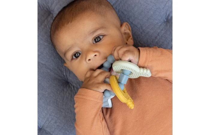 De komst van de eerste tandjes is een mijlpunt voor jouw baby, maar niet altijd even prettig! Om de pijn te verlichten heeft Little Dutch een multifunctionele bijtring ontworpen in de vorm van een sleutelbos. Het is een speeltje maar biedt ook troost en helpt de nieuwe tandjes door te komen. Het bijtspeeltje heeft verschillende texturen waardoor jouw baby genoeg te ontdekken heeft. Speciaal ontworpen dat het makkelijk vast te pakken is voor baby handjes! In zachte tinten blauw, zand en groen. Geschikt voor kinderen vanaf 4 maanden.
