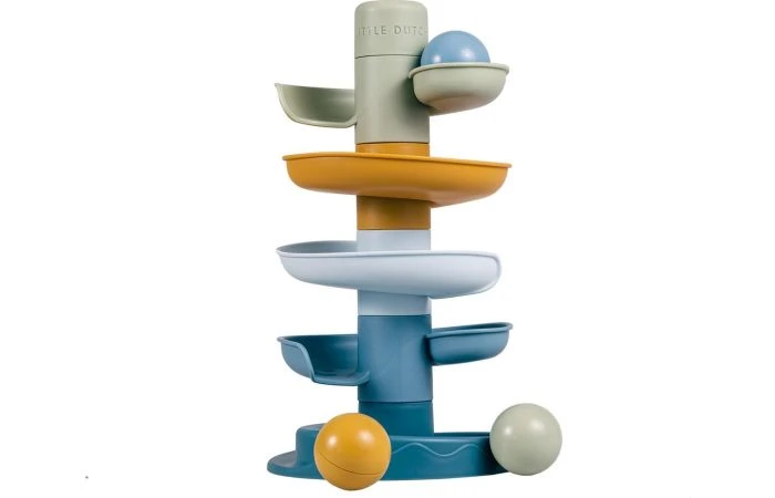 Laat de bal maar rollen! De spiraaltoren van Little Dutch zorgt voor eindeloos veel speelplezier. Deze kleurrijke set bestaat uit 5 subtiel gekleurde delen die jouw kleintje gemakkelijk op elkaar stapelt. Laat de ballen een voor een op de bovenste laag vallen en kijk hoe ze achter elkaar naar beneden rollen en slingeren. De spiraaltoren draagt bij aan de ontwikkeling van de hand-oog coördinatie en leert kleintjes over oorzaak en gevolg, waarmee het zowel leuk als leerzaam spelen is. Bij de spiraaltoren zitten standaard 3 lichte en gemakkelijk vast te pakken ballen in verschillende kleuren die bij beweging een geluidje maken. Dit speelgoed is uitgevoerd in de kenmerkende Little Dutch kleuren donkerblauw, blauw, lichtblauw, groen en okergeel. De afmeting is: 18 x 18 x 30 cm. Geschikt voor kinderen vanaf 18 maanden.