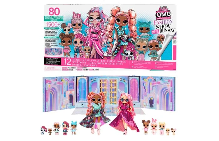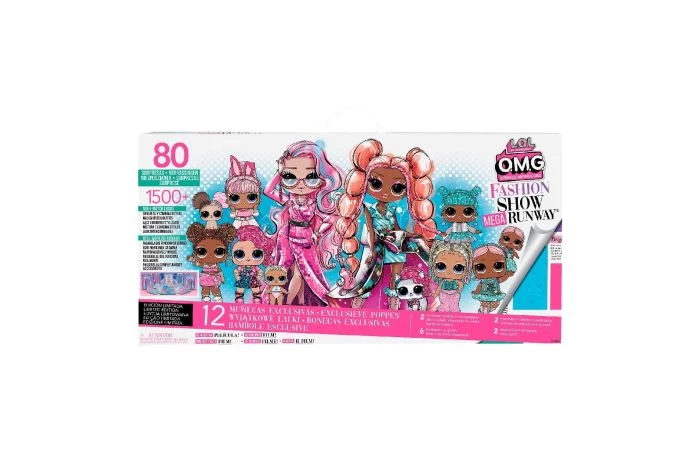 Maak kennis met de L.O.L. Surprise OMG Fashion Show Mega Runway, de ultieme verrassing voor de coolste fashionista’s die je kent! Pak 80 verrassingen uit waaronder 12 exclusieve poppen met fantastische accessoires voor 1500 mix-en-match-looks waarmee je uren creatief speelplezier kunt beleven! Open de catwalk om 4 complete speelgebieden te onthullen waar je OMG’s, B.B.’s, diertjes en Lils zich kunnen verkleden, voorbereiden en dan kunnen GAAN om hun meest chique looks te presenteren. Hun vriendschap is altijd stijlvol, dus het is tijd om de besties de allermooiste LOL Surprise-mode aan te trekken en die catwalk af te glijden! Pak 2 OMG-modepoppen uit met transformerende mode: Stylez en Sashay, 6 LOL Surprise-poppen: Big City B.B., Snow Bunny, Snow Leopard, Ice, Agent Baby en Agent 00L, 2 Lil Sisters: Lil Big City B.B. en Lil Agent Baby en 2 diertjes: Snow Leo Puppy en Agent 00L Puppy. De 4 speelgebieden van de OMG Fashion Show Mega Runway zijn het make-upstation, de kleedkamer, backstage en de catwalk.