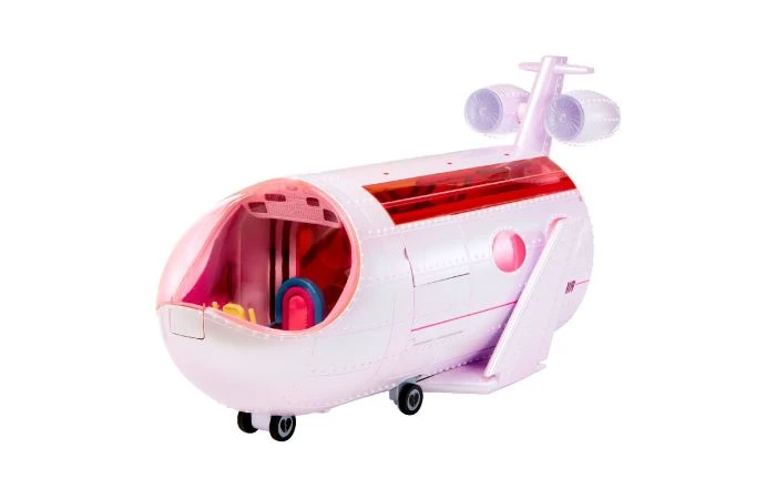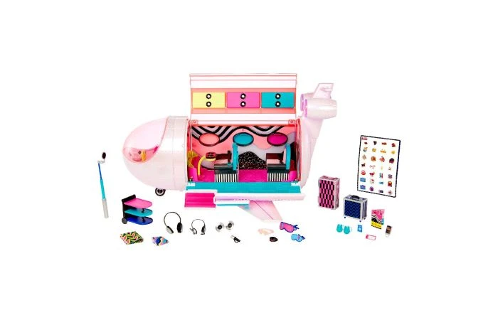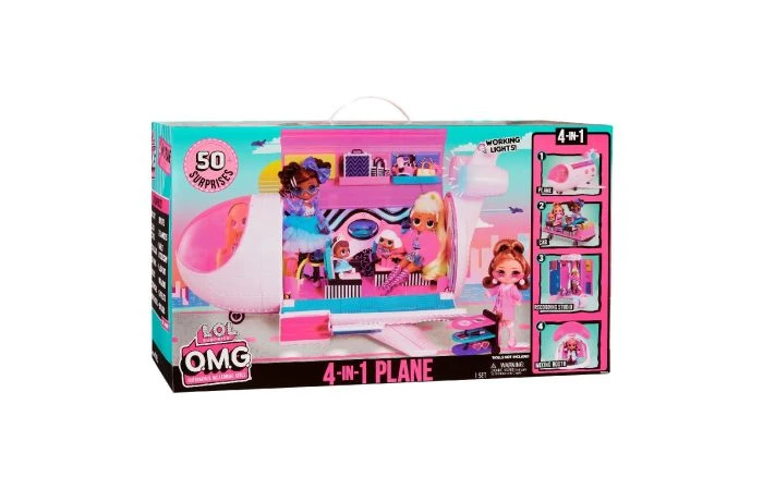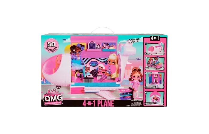Dit LOL Surprise OMG-vliegtuig is een 4-in-1-speelset, die kan transformeren in een vliegtuig, auto, opnamestudio en DJcabine. Pak 50 verrassingen uit, zoals echt werkend licht en geluid, een serveerwagentje met borden en bekers, rolkoffers, bagagevakken en stoelriemen! Geschikt voor LOL Surprise OMG-modepoppen en alle andere LOL Surprise-poppen. Als de B.B.’s landen, trek je het stoelgedeelte uit om van het vliegtuig een auto te maken. Ineens krijgen ze inspiratie: ze moeten meteen een nieuwe song opnemen! Maak los en draai het vliegtuig op zijn kant om het te veranderen in een opnamestudio en DJcabine. In het vliegtuig zitten stoelen voor 4 poppen plus een stoel voor de piloot. Als het tijd wordt om te slapen, kantel je de stoelen achterover. Inclusief accessoires, zoals 2 nekkussens, 2 slaapmaskers, 2 microfoons, 2 headsets, 2 dekens, tabletaccessoire, ticket en paspoort. Wordt inclusief 6 knoopcelbatterijen geleverd in full-colour doos met handvat. Geschikt voor kinderen vanaf 4 jaar.