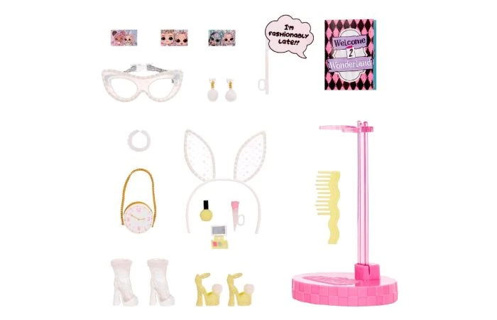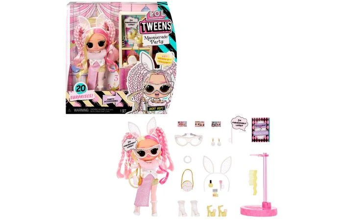 Je bent uitgenodigd voor de party van het jaar met de LOL Surprise Tweens Masquerade Party-modepop Jacki Hops. Jacki is de ster van haar crew en haast zich van fotoshoot naar fotoshoot als voorbereiding op een carrière als topmodel. Stijlvol te laat komen op een party is nooit een probleem! Trek haar haar jasje met nepbont en de konijnenoren aan en zet haar het masker op. Nu is ze klaar om te feesten in een gloednieuwe look! Pak 20 verrassingen uit, waaronder een Tweens-modepop met een supermooi gezichtje, prachtig haar en haar eigen fantastische stijl. Elke doos is inclusief een LOL Surprise Tweens-modepop, een opvallende partyoutfit, een jasje met nepbont, 2 paar schoenen, 1 paar oorbellen, een handtas met klokthema, een maskerademasker, een haarband met konijnenoren, een make-updoosje, een make-upkwast, een ketting met bergkristallen, een rekwisiet voor in een fotohokje, een haarborstel en een poppenstandaard. Wordt geleverd in windowbox en is geschikt voor kinderen vanaf 4 jaar.