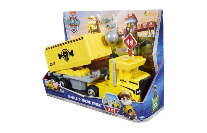 Extreme, Big Truck Pup-reddingsmissies kunnen niet zonder de X-Treme Truck van Rubble. Met een spectaculaire transformatie maak je van de truck twee aparte reddingsautos met een graafarm, een uitschuifbare kraan, een gigantische sloopkogel en een opberghok voor al het materiaal. Met levensecht licht en geluid uit de serie. De X-Treme Truck van Rubble is het ultieme PAW Patrol Big Truck Pup-reddingsvoertuig voor al je reddingsmissies op basis van de serie. Open het dak van de truckcabine, zet Rubble op de chauffeursstoel en druk op de PAW Patrol-badge op het dak om licht en geluid te activeren. Rij vervolgens met deze megareddingstruck naar de scène, koppel de aanhanger los zodat je de graafmachine op de ene plek kunt gebruiken. Transformeer de aanhanger in een commandocentrum en onthul al het speelgoedgereedschap, zodat Rubble met de sloopkogel obstakels uit de weg kan ruimen. Wissel daarna de sloopkogel om voor de kraanhaak en laad het afval in het opberghok. Vanaf 3 jaar.