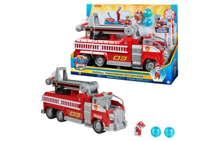 Marshall’s transformerende brandweerwagen met epische transformaties, een uitschuifbare en draaiende reddingsladder, een waterkanonwerper, knipperende lichtjes en realistische geluiden. Plaats het meegeleverde Marshall-actiefiguur in de cabine en race naar de noodsituatie. Als je bent aangekomen, transformeer je de wagen van Marshall door de bovenkant naar achteren te trekken. Kun je de bovenkant van het gebouw niet bereiken? Geen probleem met deze extra lange ladder! Draai hem 360 graden en trek hem uit. Druk op de knop boven op de brandweerwagen voor licht en spannende geluidseffecten. Laat je vriend in nood veilig naar beneden glijden en op het trampoline-reddingsnet landen. Gebruik daarna de waterkanonwerper om de brand te blussen. Druk op de knop aan de binnenkant van de truck om de werper omhoog te laten komen. Laad een projectiel (2 incl) en druk op de knop aan de achterkant om het te lanceren. Geschikt voor kinderen vanaf 3 jaar.