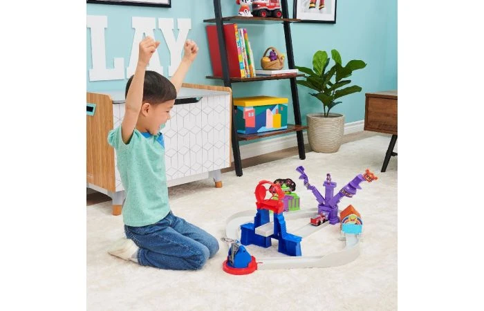 Dit PAW Patrol-speelgoed heeft een draaiende lanceerder voor meerdere op de film geïnspireerde reddingsacties. Lanceer Marshall richting de gehoorzaamheidsschool of draai het platform en lanceer hem naar het stadhuis. Met 3 filmreddingsacties om Avonturenstad te redden: barst door de muur van de gehoorzaamheidsschool, stop het vuurwerk in het stadhuis en vang burgemeester Humdinger. Als de toren opensplijt, zie je de burgemeester in zijn ondergoed staan. Deze spannende PAW Patrol-speelset bevat een metalen Marshall-voertuig op een schaal van 1:55, dat niet mag ontbreken in je PAW Patrol-voertuigcollectie. Moet door een volwassene in elkaar worden gezet. Inhoud: 1 Red Avonturenstad Racebaan Speelset, 1 True Metal-voertuig, 1 stickervel en een gebruiksaanwijzing. Wordt geleverd in full-colour doos. Geschikt voor kinderen vanaf 3 jaar.