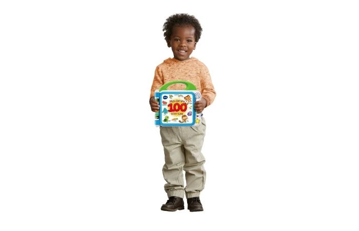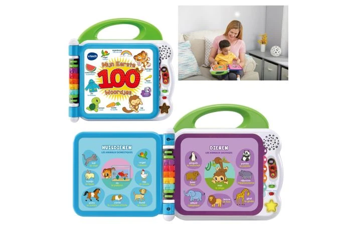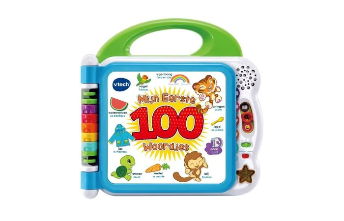 Leer 100 leuke woordjes in zowel het Nederlands als in het Frans door op de plaatjes van de interactieve bladzijden te tikken. Druk op de knipperende ster-toets en zing mee met de vrolijke liedjes. Maak kennis met de dierenvriendjes en speel en leer met ze mee! Het omslaan van de bladzijden en het drukken op de plaatjes van de bladzijden en de ster-toets bevordert de ontwikkeling van de oog-hand coördinatie. Stevig en duurzaam design. Beschikt over een aan/uit schakelaar en gaat automatisch uit. Wordt inclusief 2 AA-batterijen geleverd in try-me verpakking. Geschikt voor kinderen van 1,5 tot 4 jaar.